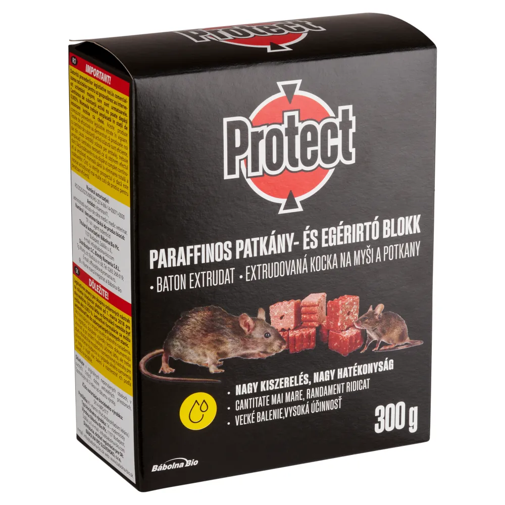 A Protect paraffinos rágcsálóirtó blokk 300gr felhasználásra kész 12x25g-os rágcsálóirtó blokk. A blokk keserű anyagot (denatónium-benzoát) tartalmaz, amely segít megelőzni a készítmény ember általi véletlen fogyasztását.
